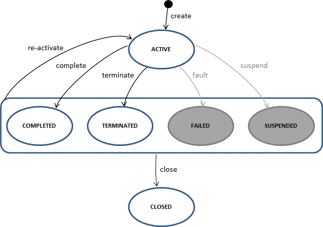 Case instance refers to an instance of the case plan model. More specific, it is an instance of the single top-level stage in a case definition. The lifecycle of a case instance is the following: