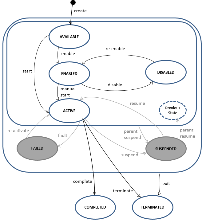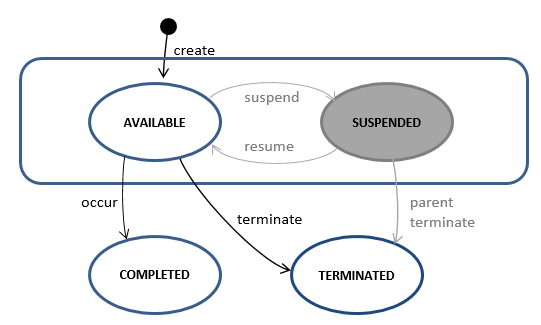 The following descriptions cover the CMMN lifecycles as supported by the CIB seven engine. This is a subset of states and transitions that the CMMN standard defines. Any state or transition that is currently not supported is marked in grey.