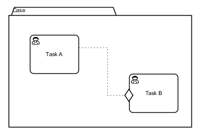 This case contains two human tasks Task A and Task B that are connected by a sentry. The sentry expresses that Task B can be enacted when Task A finishes. This is formally specified by lifecycles. In our example, the following steps might take place: