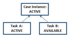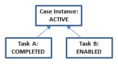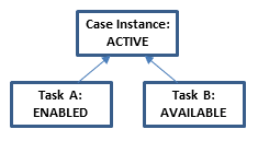 Notice how the lifecycle states define the overall state of the case and restrict the interactions that are possible. For example, the tasks A and B can only be worked on when in state ACTIVE. Before, they go through states AVAILABLE and ENABLED, which represent that conditions for working on the task are not yet met, for example that the task was not manually started or that a sentry is not fulfilled yet.