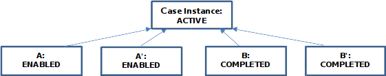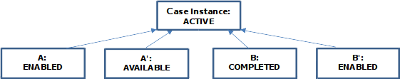 This case contains two human tasks A and B that are connected by a sentry. Task B gets ENABLED if any conditions are fulfilled and task A gets ENABLED if an instance of B completes. Furthermore both tasks are repeatable as long as the variable score is less than 50.