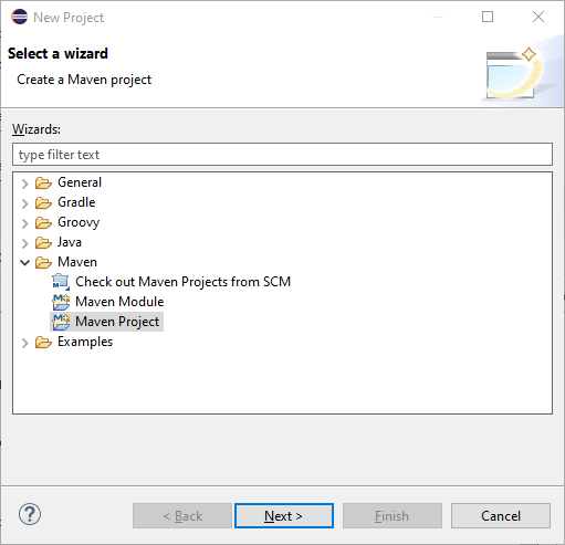 - Go to File -> New -> Project… and select Maven -> Maven Project