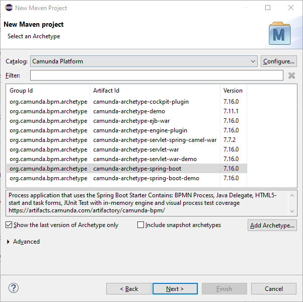 - Add archetype catalog (Preferences -> Maven -> Archetypes -> Add Remote Catalog): https://artifacts.camunda.com/artifactory/camunda-bpm/