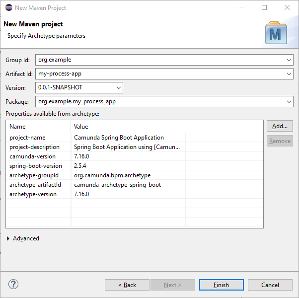 - Specify Maven coordinates and Camunda version and finish the project creation.