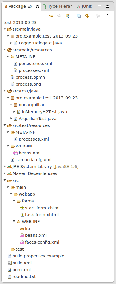 | Process Application (EJB, WAR) | Process application that uses a shared CIB seven engine in a Java EE Container, e.g., Wildfly. Contains: Camunda EJB Client, Camunda CDI Integration, BPMN Process, Java Delegate as CDI bean, HTML5- & JSF-based start and task forms, configuration for JPA (Hibernate), JUnit Test with in-memory engine and visual process test coverage, Arquillian Test for Wildfly, Maven Plugins or Ant build script for one-click deployment in Eclipse |