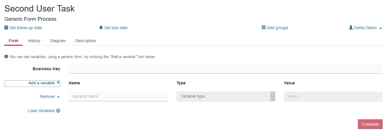 Hit the Add a variable button to add a variable that will be passed to the process instance upon task completion. State a variable name, select the type and enter the desired value. Enter as many variables as you need. After hitting the Complete button, the process instance contains the entered values. Generic task forms can be very helpful during the development stage, so you do not need to implement all task forms before you can run a workflow. For debugging and testing this concept has many benefits as well.
