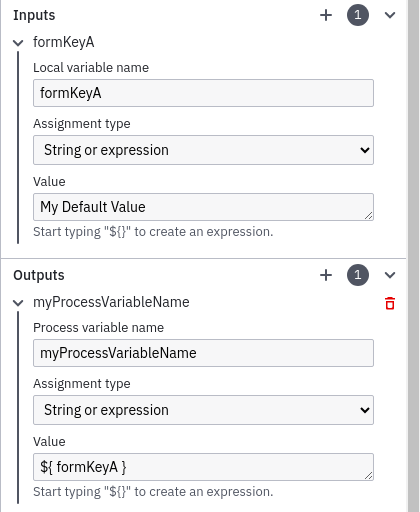 - When the User Task has an Input Parameter defined with the same name as the form field key, then this local variable will be used. In this case, an Output Parameter needs to be defined to map the local variable to a process variable for usage in other process elements.