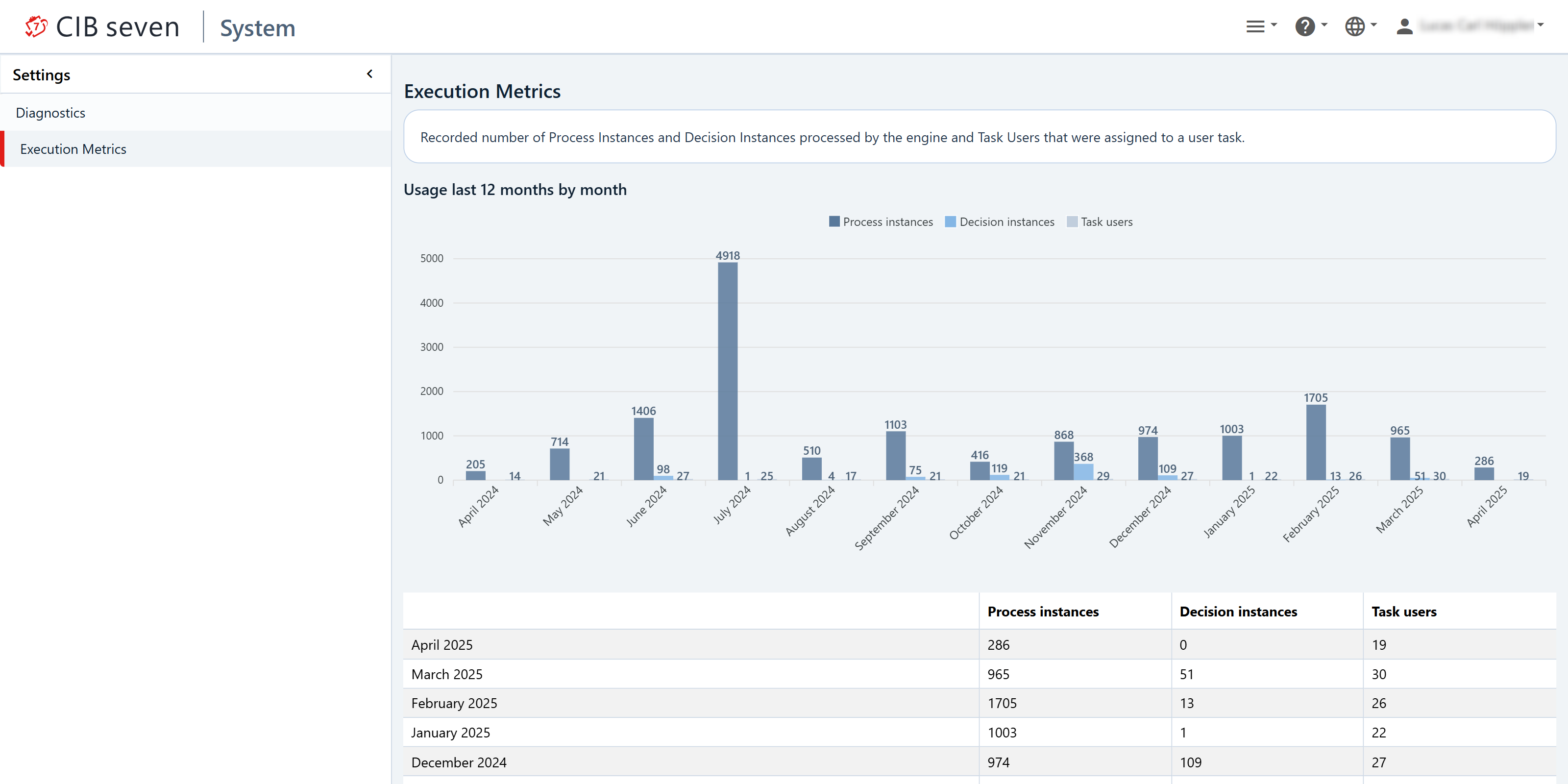 The Execution Metrics menu in Admin displays an approximate number of Process Instances and Decision Instances processed by the engine and Task Users that were assigned to a user task.