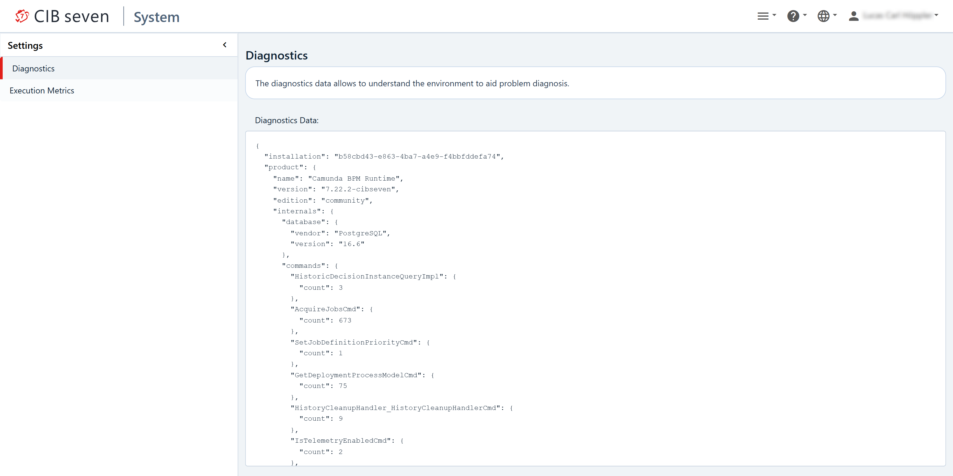 The main purpose of the Diagnostics menu is to increase transparency by giving you easy access to important system diagnostics information. In the event of an issue, this should also improve problem diagnosis by enabling you to quickly understand and share the Camunda environment you are running.
