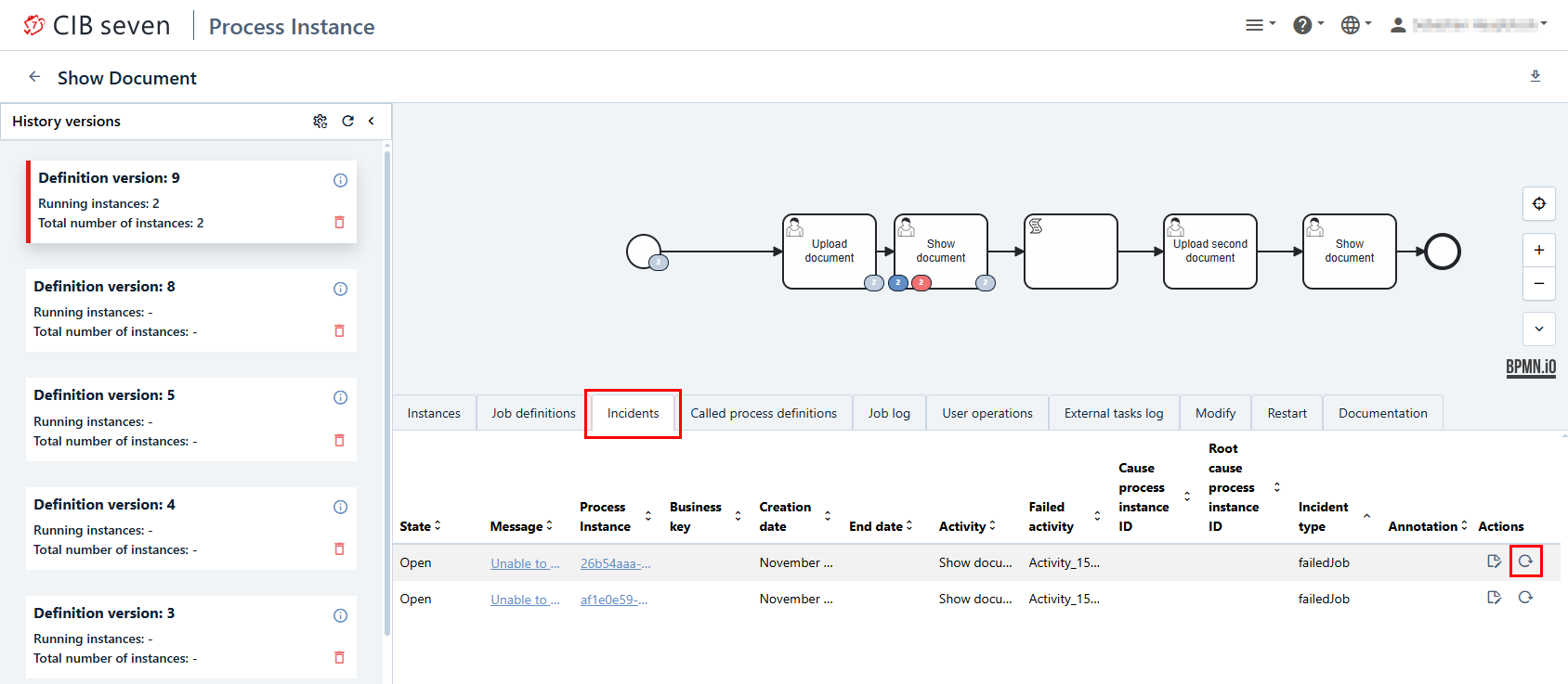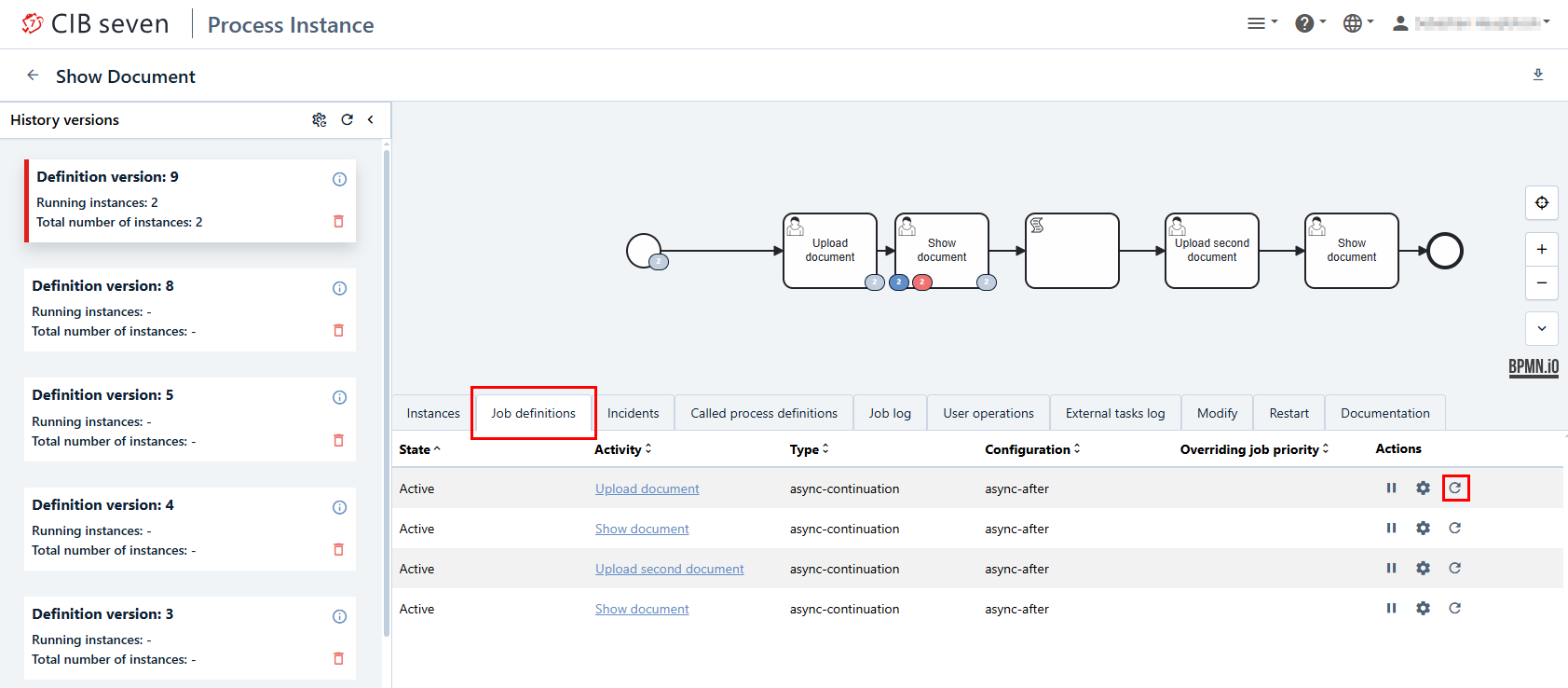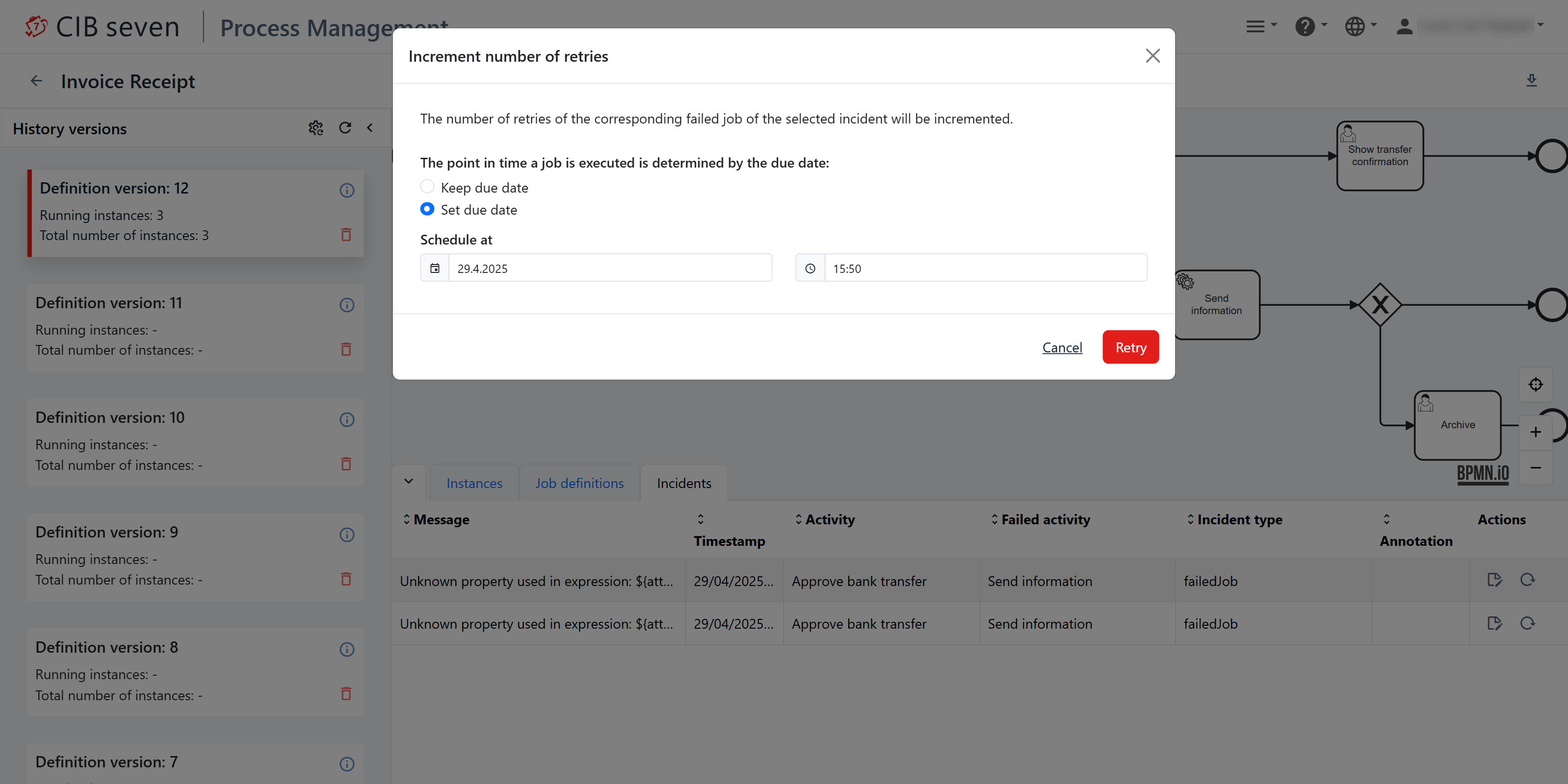 It is also possible to do a bulk retry of failed jobs. To do so, switch to the ‘Job definitions’ tab in the process definition view and locate the corresponding failed activity. Clicking the retry button here allows you to set the number of retries for all the defined jobs of the process definition.