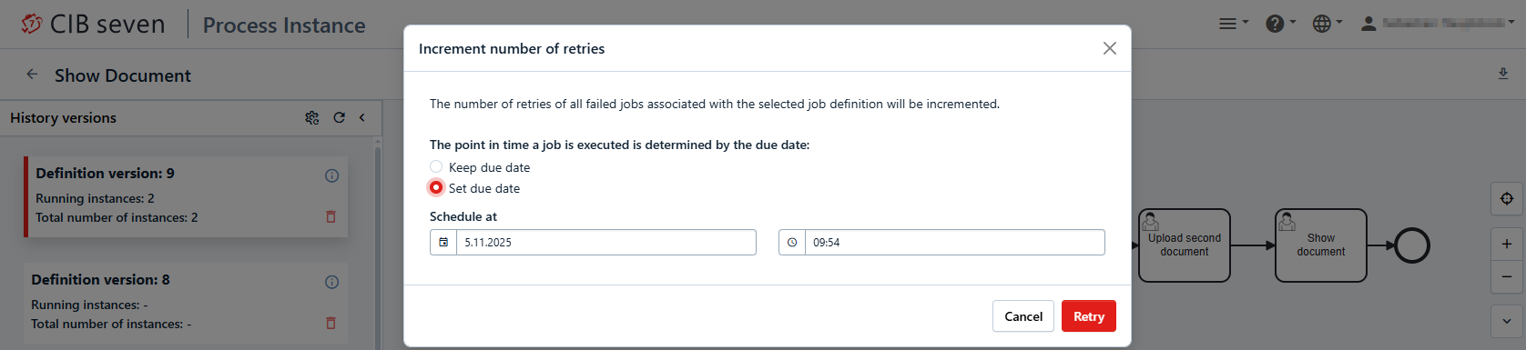 The following dialog allows you, just as with retries described above for single failed jobs, to decide whether to keep the due date or set a date of your choice.