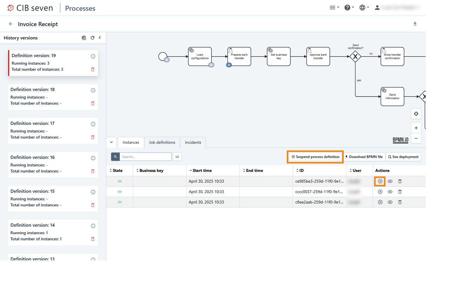 In the process definition view you can suspend a selected process definition or a selected process instance. Suspending a process definition suspends all running process instances. The two buttons are highlighted in orange color in the next screenshot.