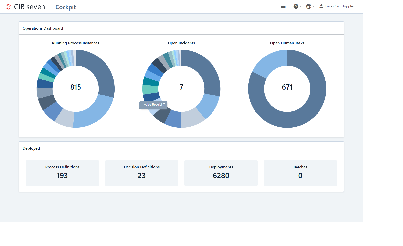 At the top of the dashboard you can see a pie charts that display the amount of running process instances, open incidents and open human tasks. By clicking on the number or a section of the pie chart, you are forwarded to the respective search with preselected query parameters.