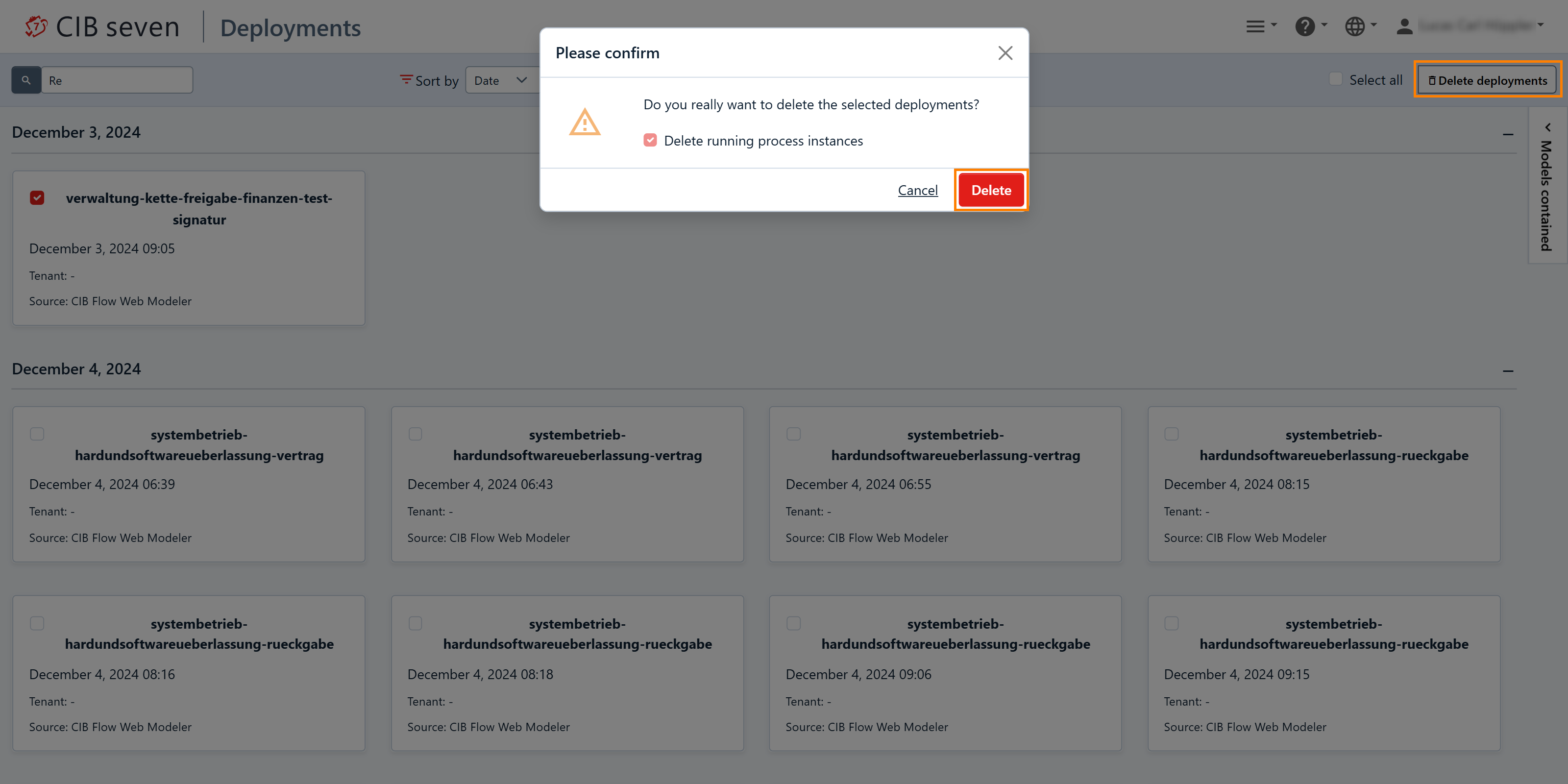 To delete a deployment, select the deployment and click the ‘Delete deployments’ button. A confirmation dialog will appear, notifying you that any running instances will also be deleted. The button is highlighted in orange in the screenshot below.