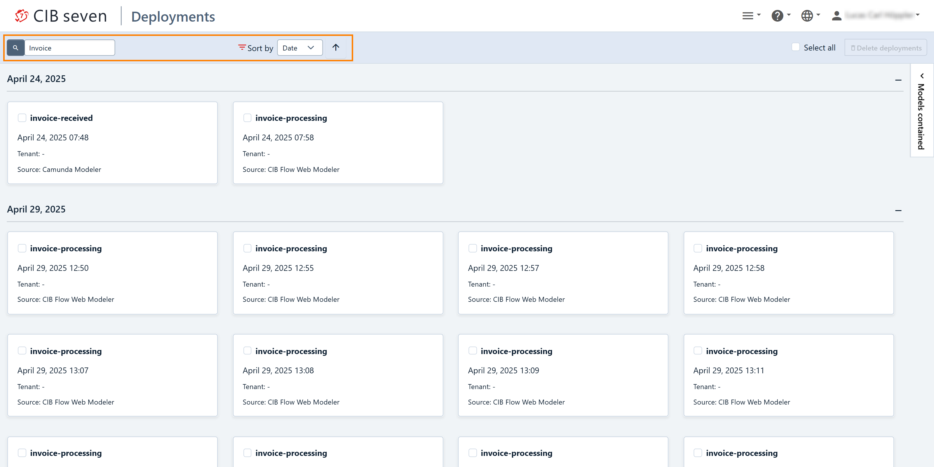Independently of the search, ordering for the deployment list can be set using the sorting parameter above the search field. It is possible to order by deployment date or name. Clicking on the arrow on the right side of the sorting criterion changes the ordering (ascending and descending).