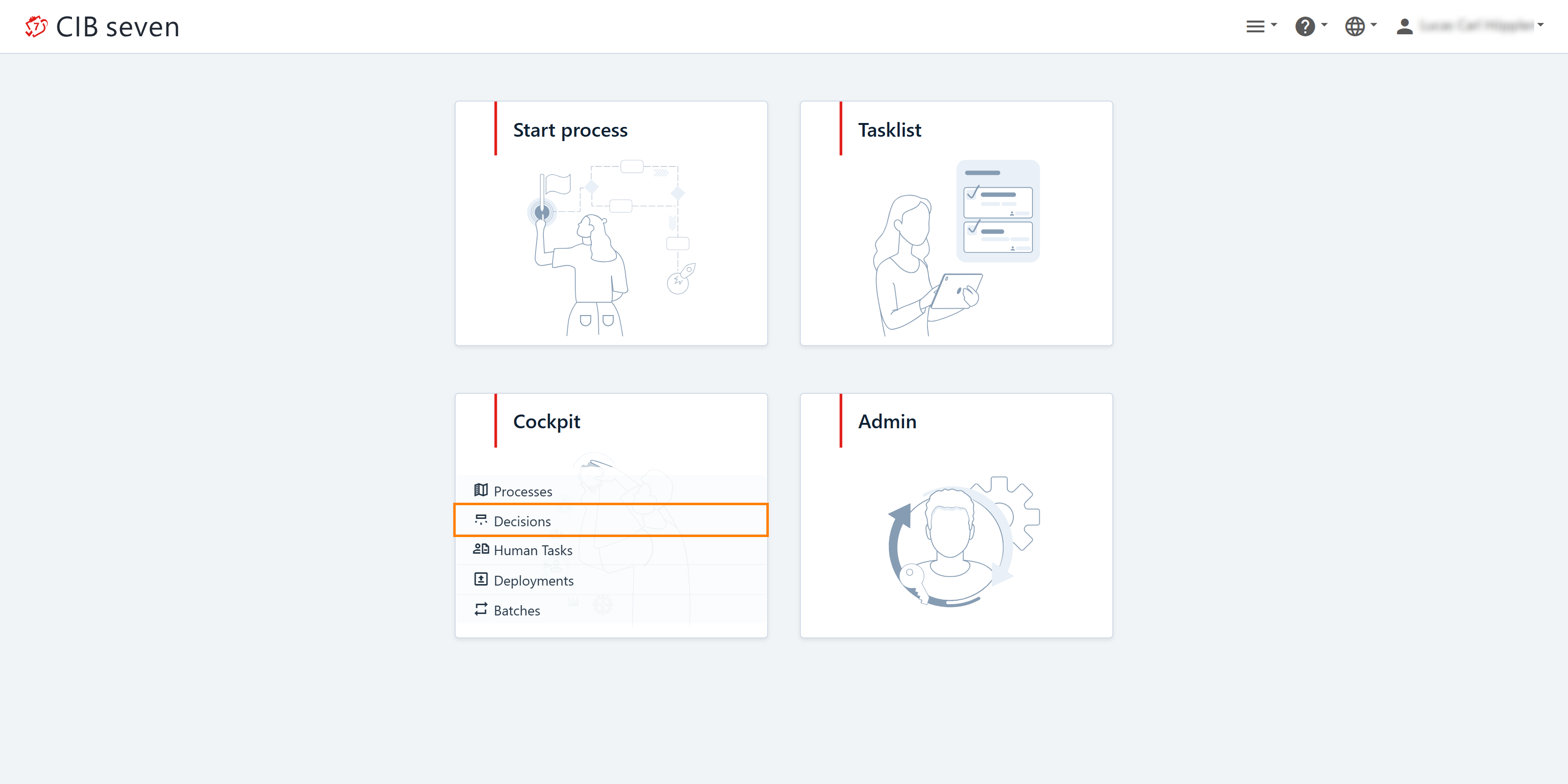 The Decisions dashboard in CIB Seven Cockpit is the entry point for decision monitoring. In the following screenshot, we select “Decisions” to get an overview of the deployed decision definitions.