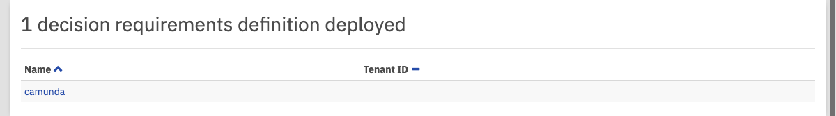 This plugin provides you with a list of deployed decision requirements definitions. You can click on the name of a decision requirements definition to go to the [decision requirements definition view][decision-requirements-definition-view] and access more details.