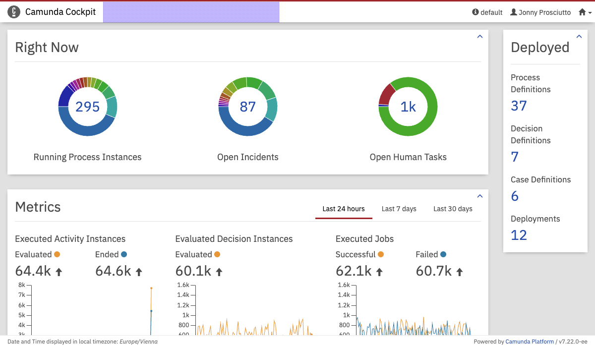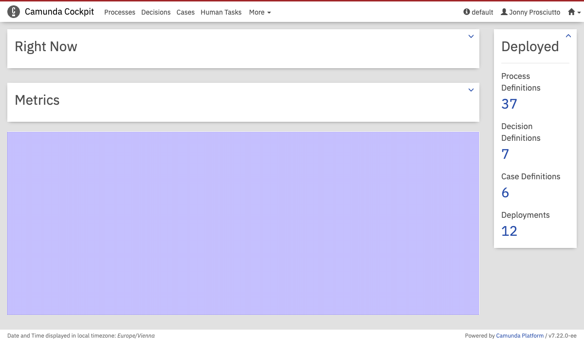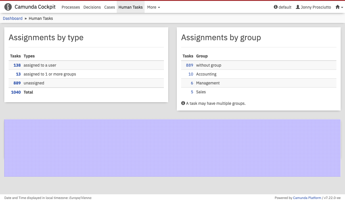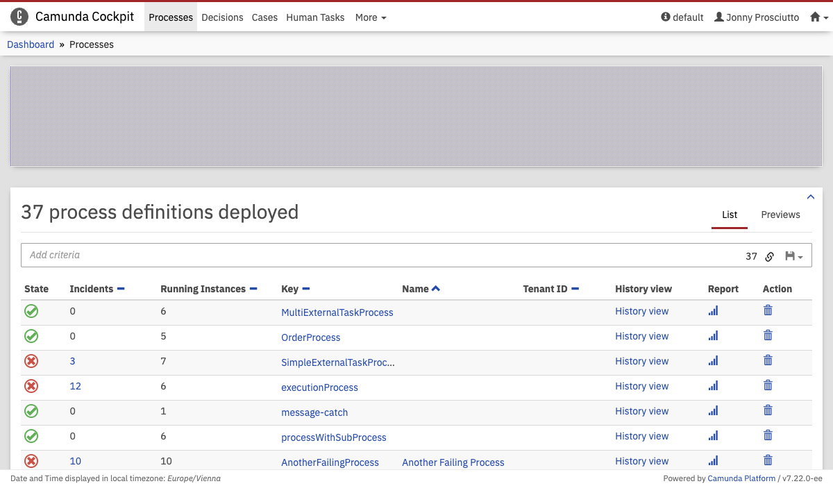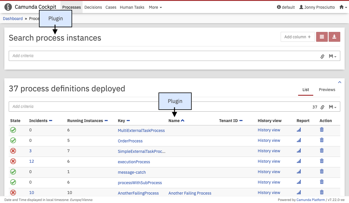 Cockpit defines a plugin concept to add own functionality without being forced to extend or hack the Cockpit web application. You can add plugins at various plugin points, e.g., the processes dashboard as shown in the following example: