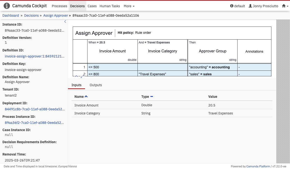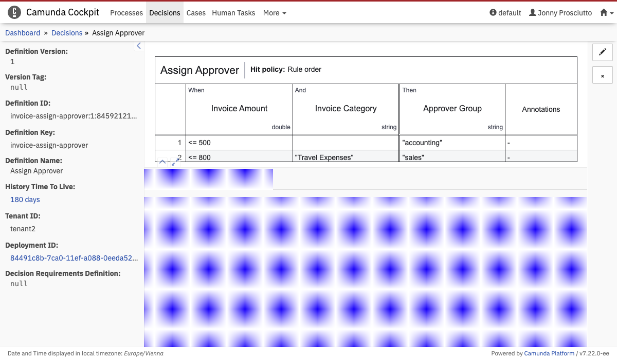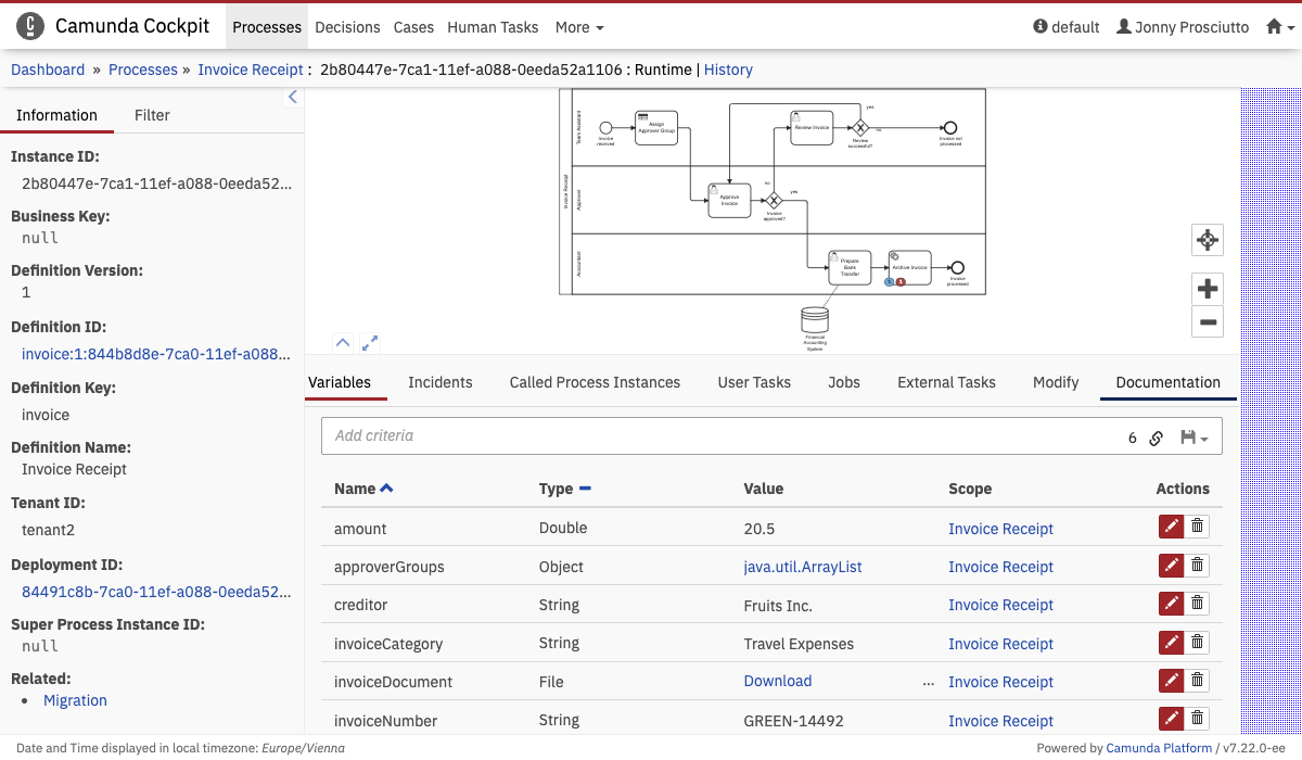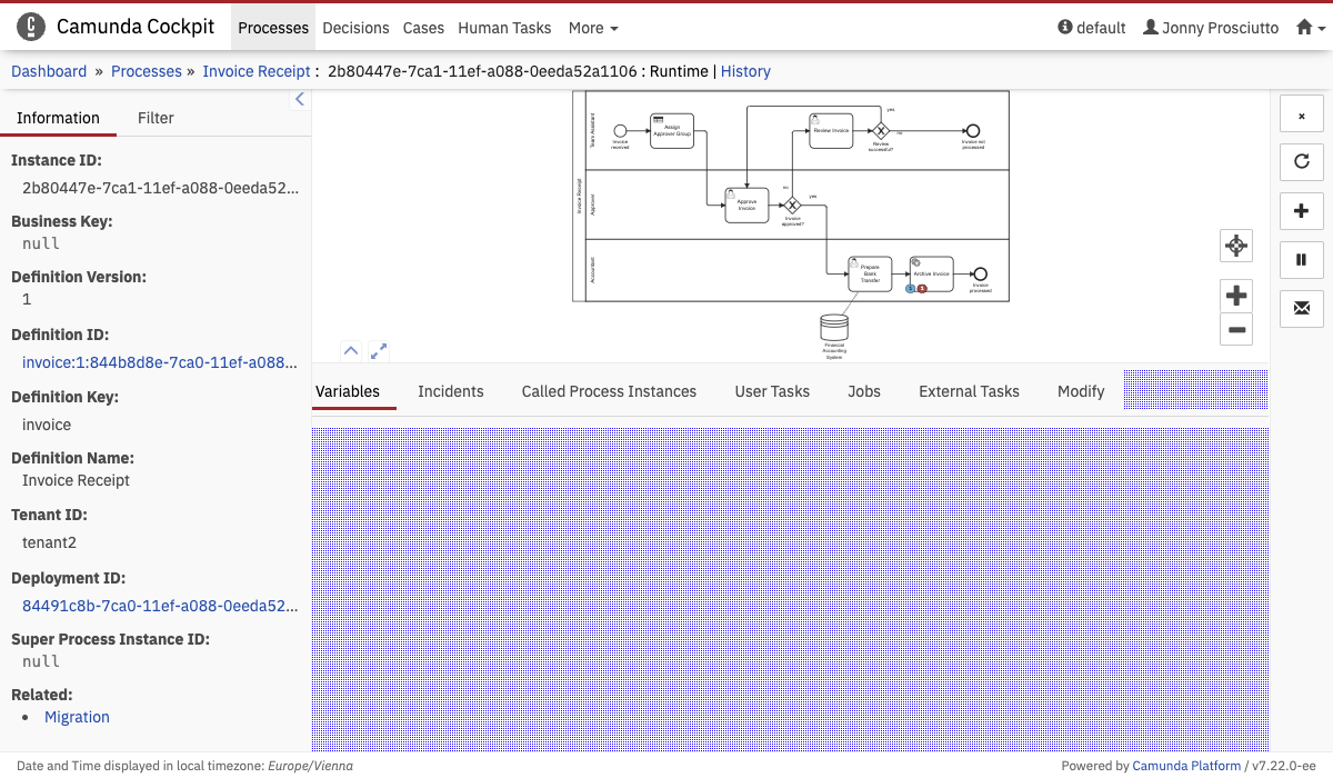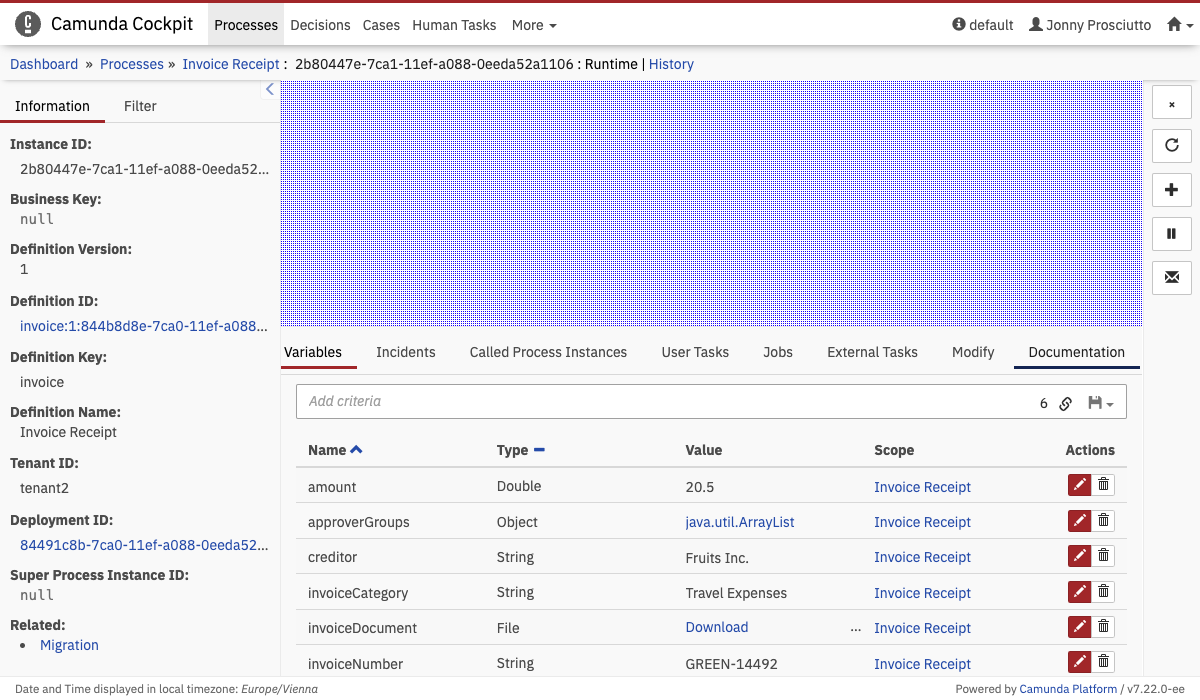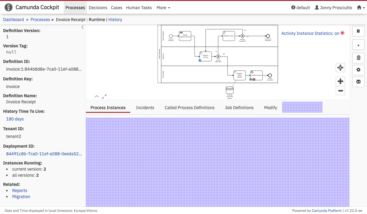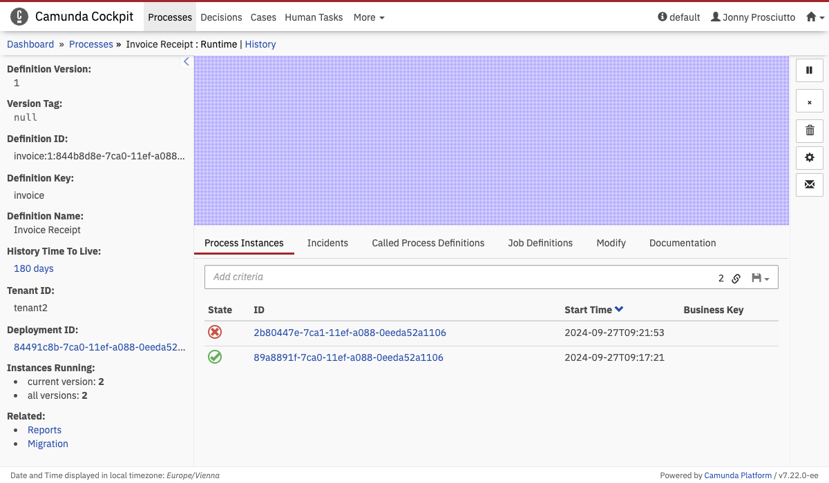 In this example we deactivate the cancel action in the Cockpit process instance view and disable the job retry action button: