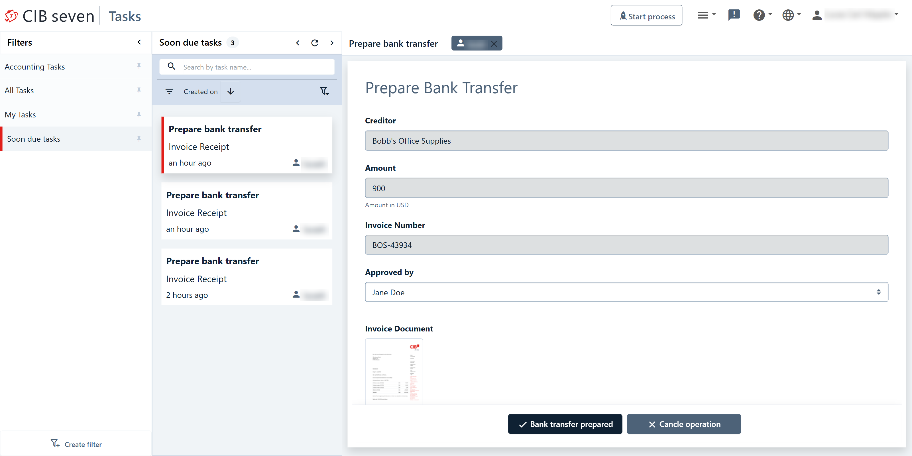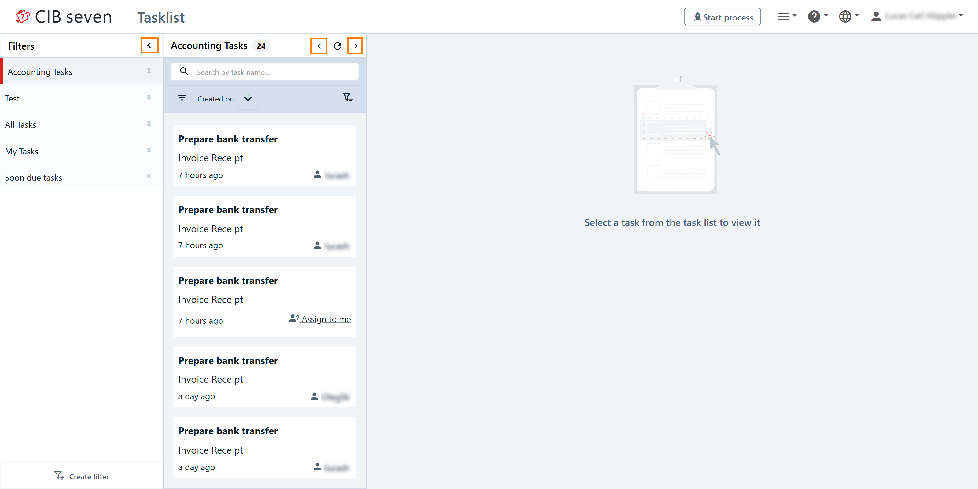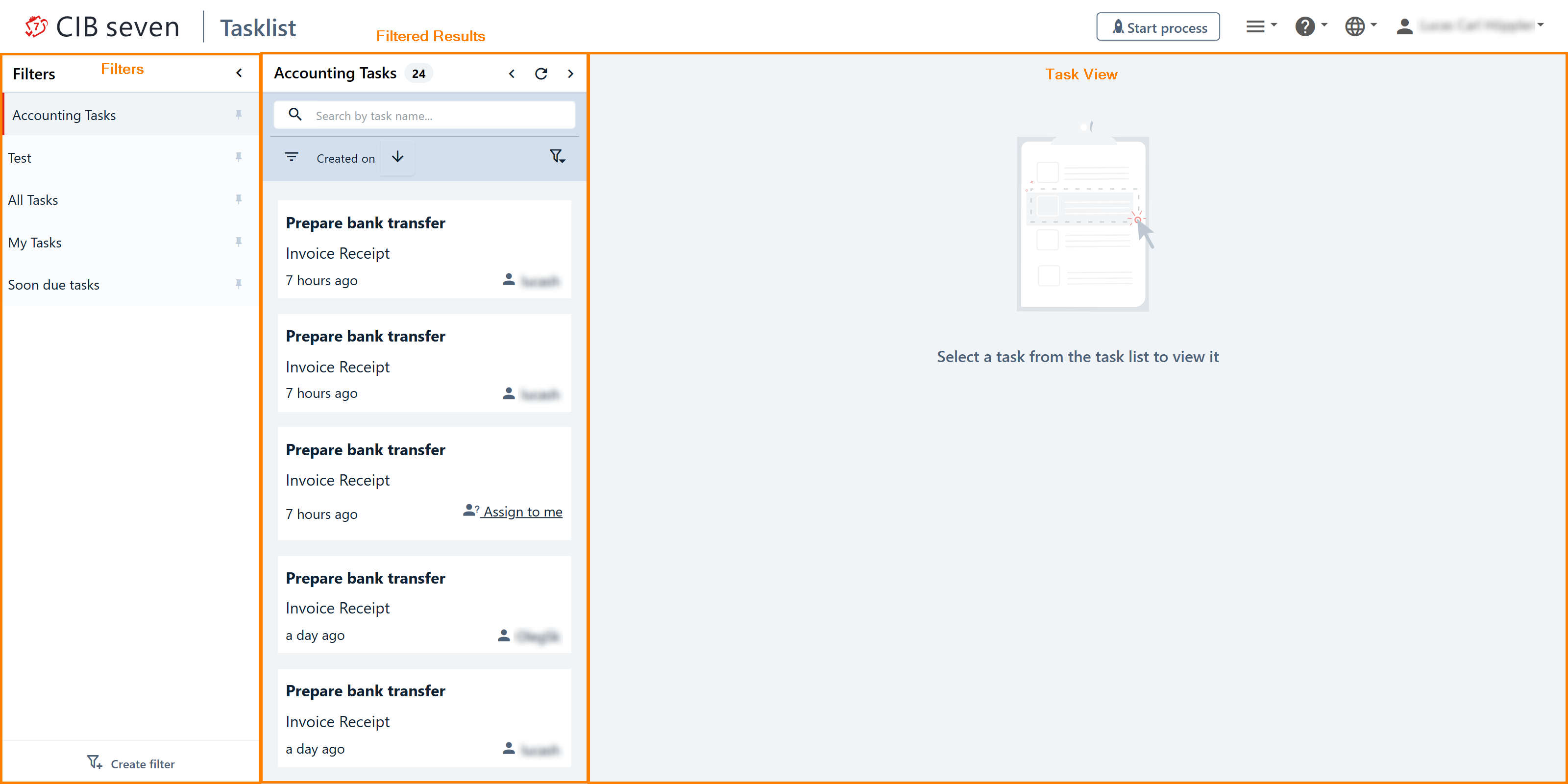 On the dashboard of Tasklist you see an overview of pending tasks. On the left side of the screen, an overview of the filters is displayed. In the middle, the filtered tasks are shown and on the right the task view.