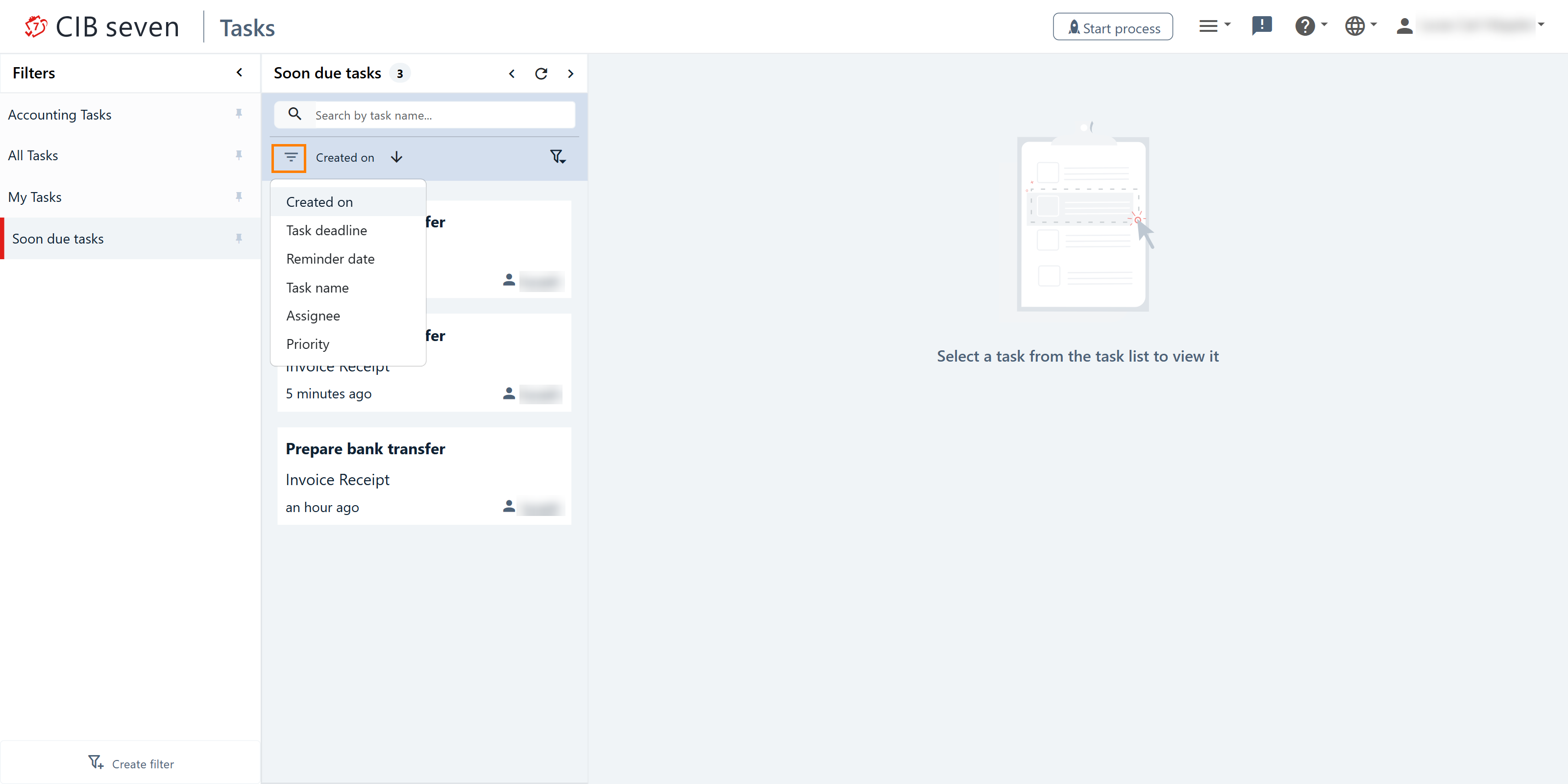 Here you can see an overview of all tasks for the selected filter. The filter with the lowest priority is displayed first. After selecting the appropriate filter, you will see an overview of all tasks, sorted by a specified criteria (by default it is sorted by the creation date). You can change the sorting of the tasks by clicking on the name of the sorting property. You can toggle between ascending and descending order.