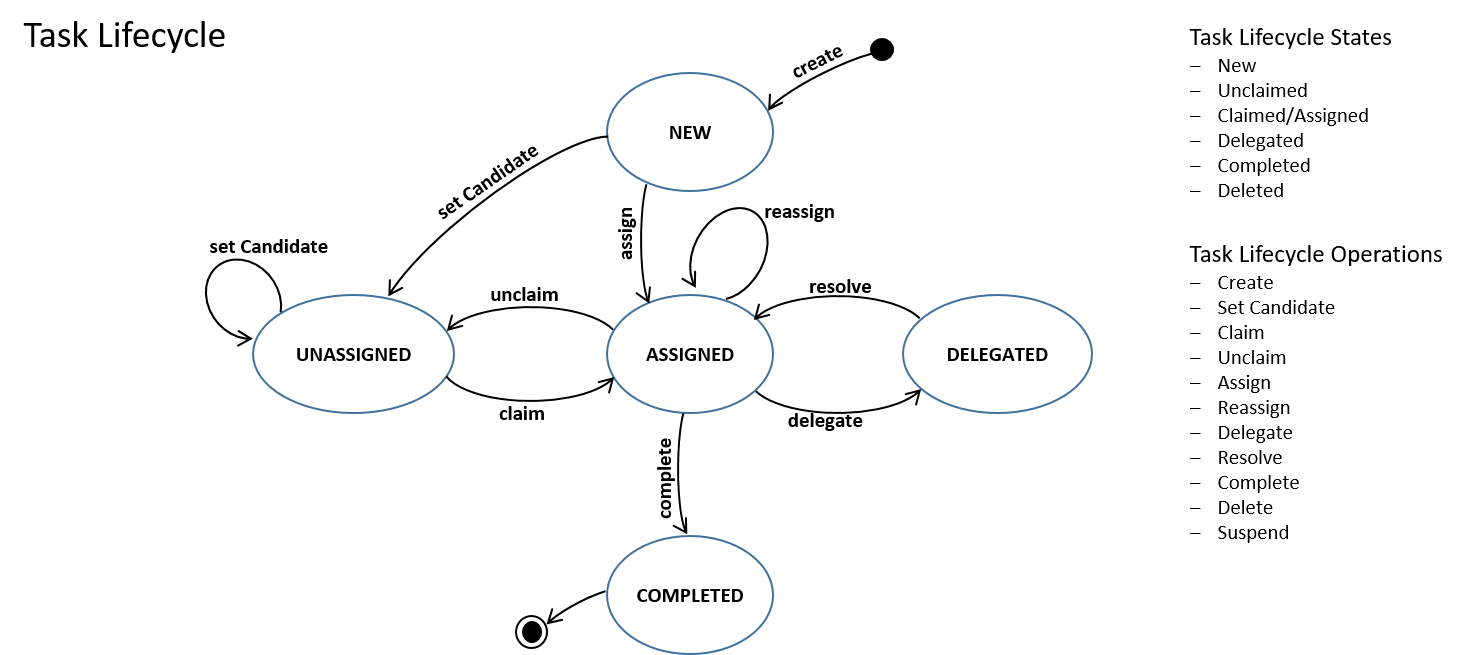 The diagram below shows the task lifecycle and supported transitions supported by Camunda. To get to know how to programmatically work with the lifecycle in your application, refer to the Java-API Reference .