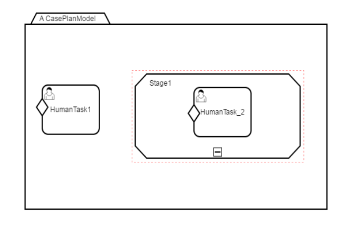 Consider the below example in which there are two human tasks. HumanTask1 is defined inside the case model and the HumanTask_2 is defined inside the stage.