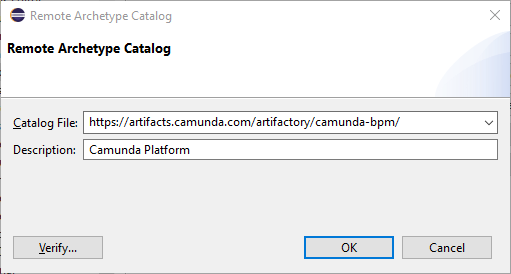 Enter the following URL and description, click on Verify… to test the connection and if that worked click on OK to save the catalog.