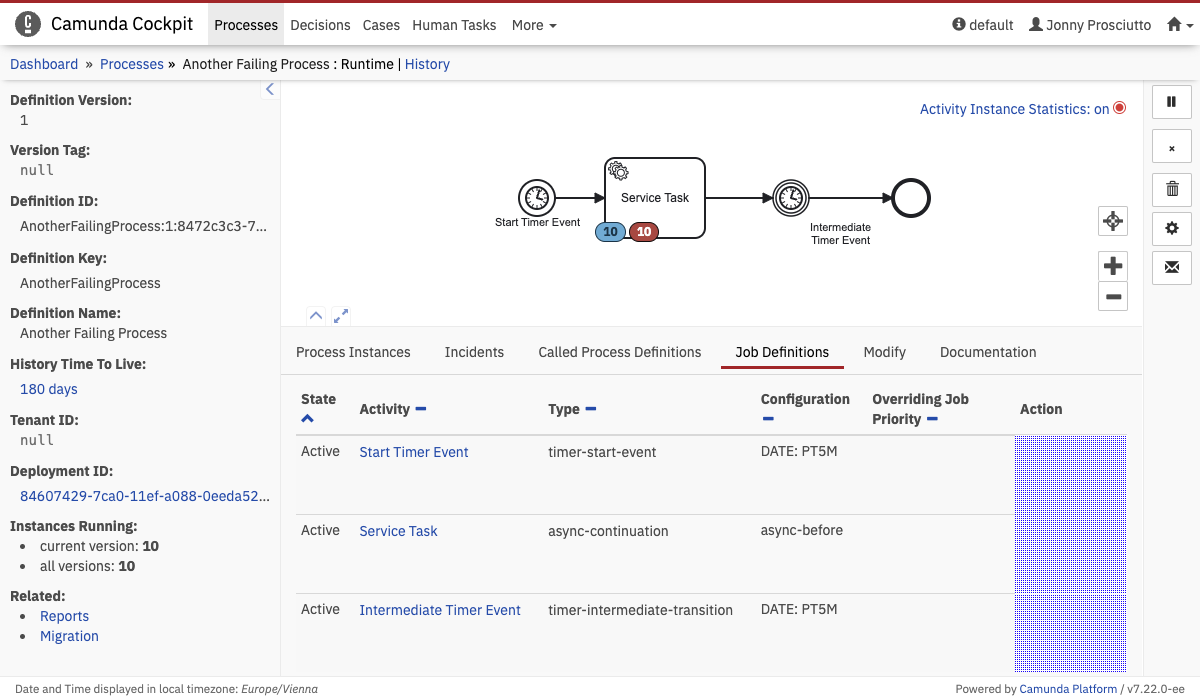 In this example we deactivate the cancel action in the Cockpit process instance view and disable the job retry action button: